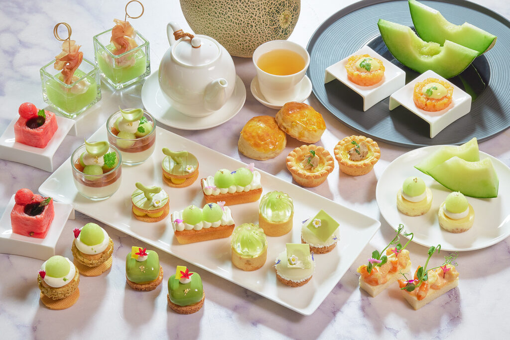 甜點部分由點心房主廚黃柏欽操刀,選用日本山形縣庄內地區出產、甜度高且香氣濃郁的哈密瓜,設計14道鹹甜點組合,推出「山形縣庄內產哈密瓜下午茶」,內容涵蓋哈密瓜包種茶塔、哈密瓜泡芙、哈密瓜燻鮭魚塔塔等,融合日式細膩與法式甜點技法,口感與視覺皆細緻動人。活動自7月19日至8月18日限量供應,極富品味價值。