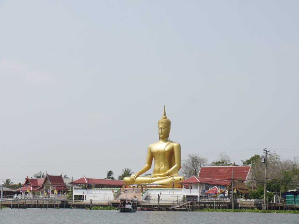 在長尾船上遠遠看到「班加寺」的金色佛像,這可是河中島最大的地標,接著看見一個白色傾斜的佛塔,據說這全是黏土捏出來的,太神奇了。