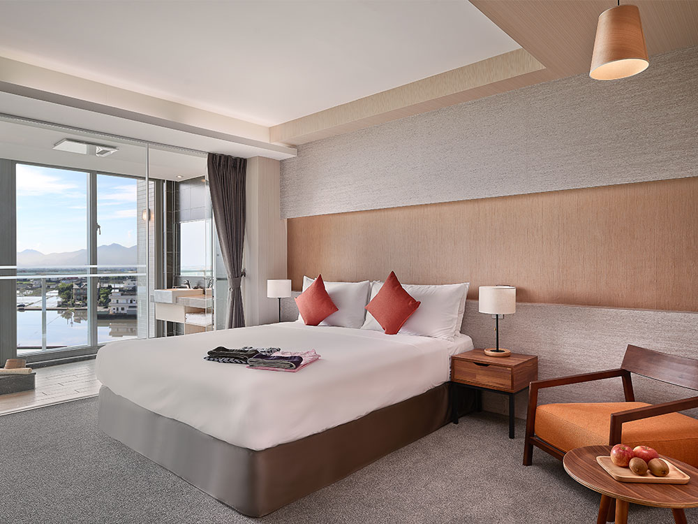 「玥-山景客房一泊一食雙人住宿券」主打舒適山景房型與精緻早餐,入住即可免費暢遊5.7公頃的日式主題園區,園內融合禪風庭園、日式造景與自然綠意,營造出彷彿置身京都的靜謐氛圍。