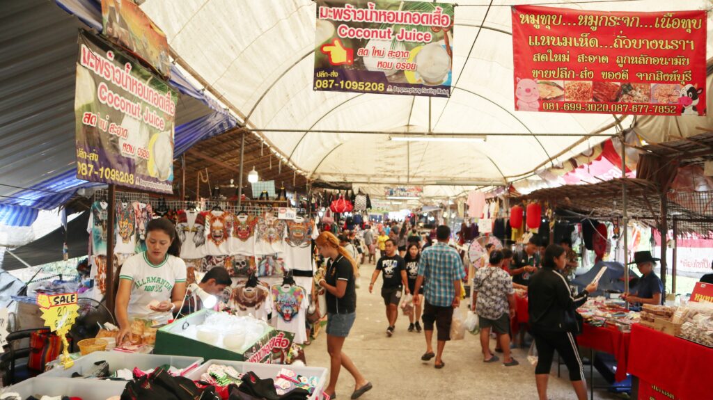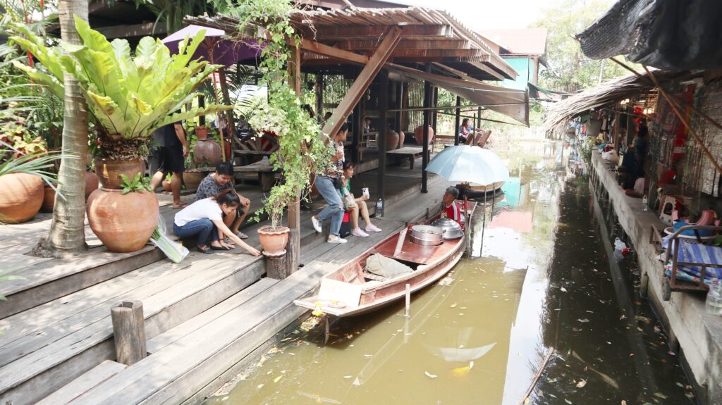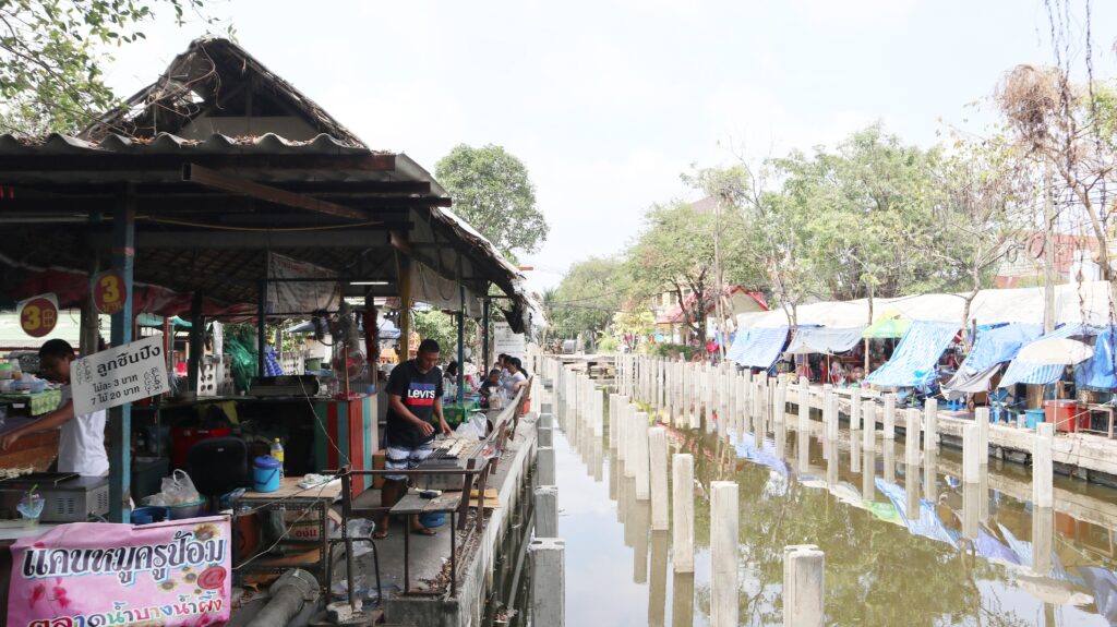 🕵️『邦南彭水上市場』是個沿著昭披耶河的支流河岸延展的市集,長約一公里,它不像丹能朵莎或是安帕瓦水上市場,有著川流不息的小船,只停泊了幾艘小船,但攤商很多ex.小吃甜點、服飾、飾品..及農村的草本製品..等,且東西十分親民,很能滿足強大購滿慾的朋友,還能購買飼料餵魚、餵小豬,是個大小朋友都喜歡的好地方。