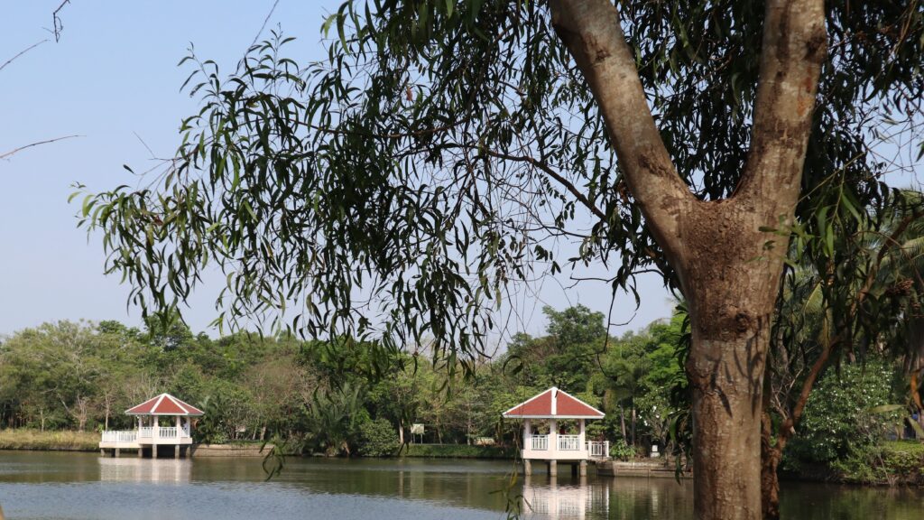 約莫20分鐘我們終於騎到『Sri Nakhon Khuean Khan Park and Botanical Garden』,這裡是泰國農業大學的實驗森林,占地32公頃十分遼闊,整片公園由樹林、水道、木棧道所組成。泰國政府為了保護島上生態,限制島上的建築高度,更設立了三座觀景台,而探索公園最好的方式就是騎單車了,若從島上北岸的邦喀造碼頭上岸,可直接騎入森林祕境。騎著單車可以橫跨湖泊、穿越樹林,完全沉浸在清新的綠林中,很是舒活。