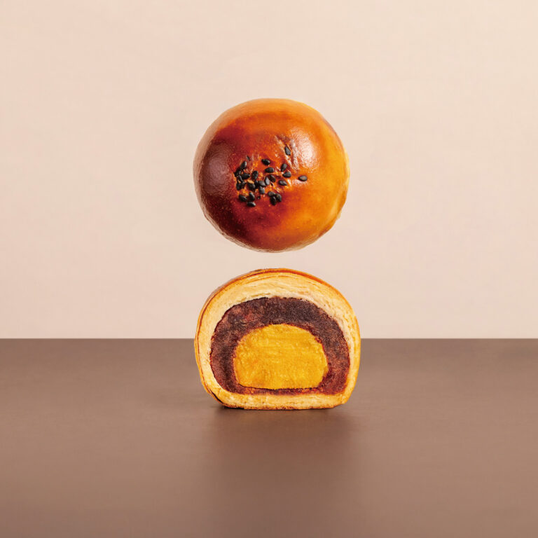 《光嶼・五味藏心》禮盒共有8入,經典代表【心蛋黃酥】,內餡嚴選契作紅豆與一整顆28天鹽漬的鴨蛋黃,搭配三款奶油調和而成的金黃酥皮,外酥內綿、甜鹹得宜。煙波獨家限定款【東方美人蛋黃酥】,茶香融合紅豆泥與鹹蛋黃,口感層次豐富。