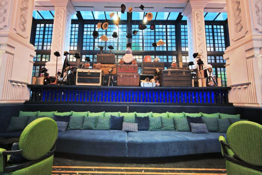 - 大廳採挑高寬敞的空間設計,使用飽和的色彩搭配多種裝飾,充滿強烈的視覺衝擊。
